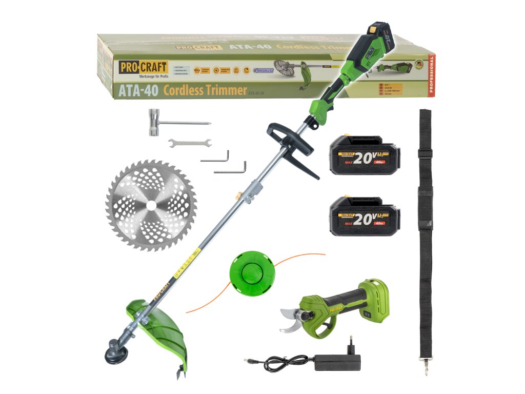 Oba stroje jsou součástí společného 20V Li-ion bateriového systému Procraft, což znamená plnou kompatibilitu akumulátorů. Balení této sady je mimořádně praktické, neboť obsahuje dvě výkonné 4Ah baterie a nabíječku, což zajišťuje dlouhou dobu provozu a minimalizuje prostoje. Dále je součástí křovinořezu pilový kotouč, strunová hlava, popruh a montážní klíč.