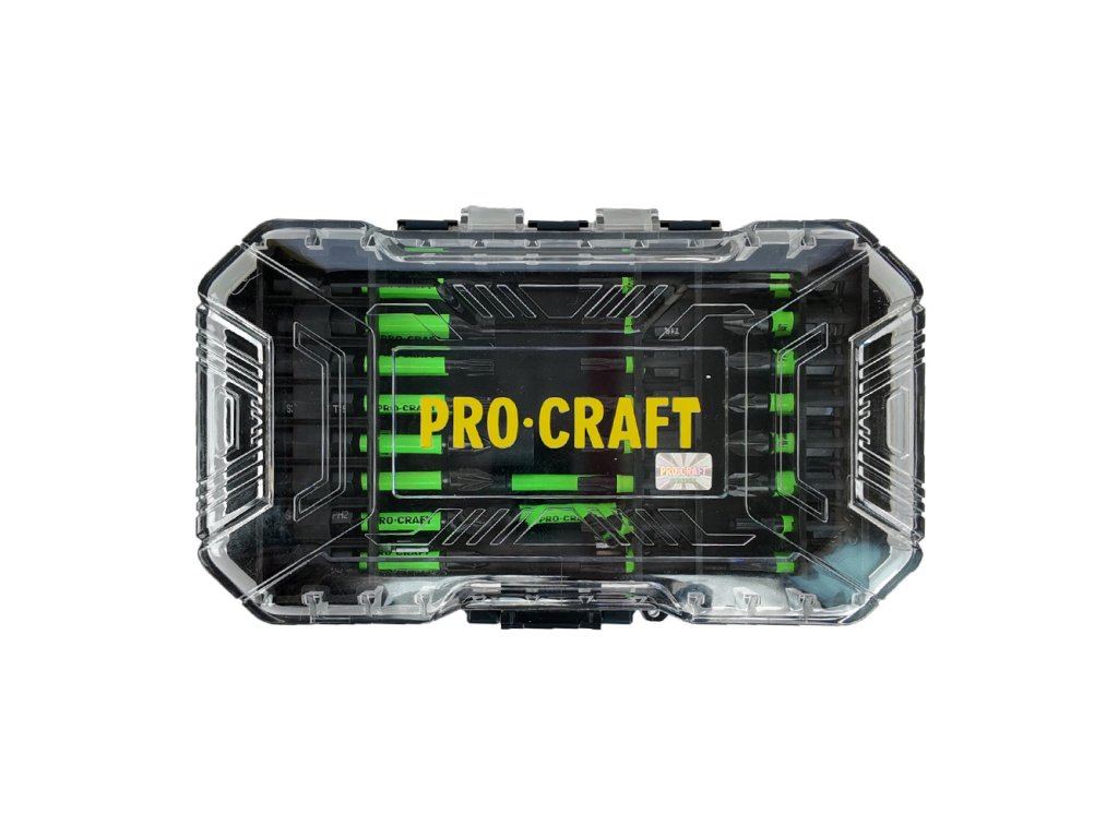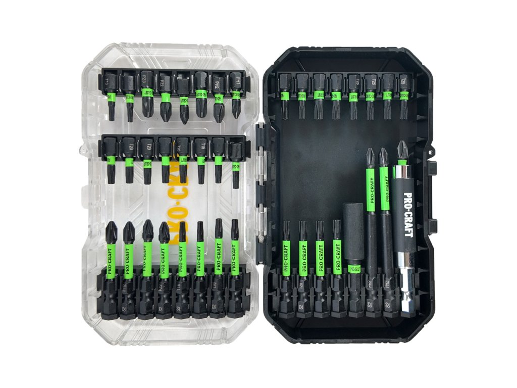 25 ks 25mm bitů: Phillips: PH1x1, PH2x2, PH3x1, Pozi: PZ1x1, PZ2x1, PZ3x1, Torx: T10x2, T15x3, T20x5, T25x4, T27x1, T30x1, T20 Security, T25 Security