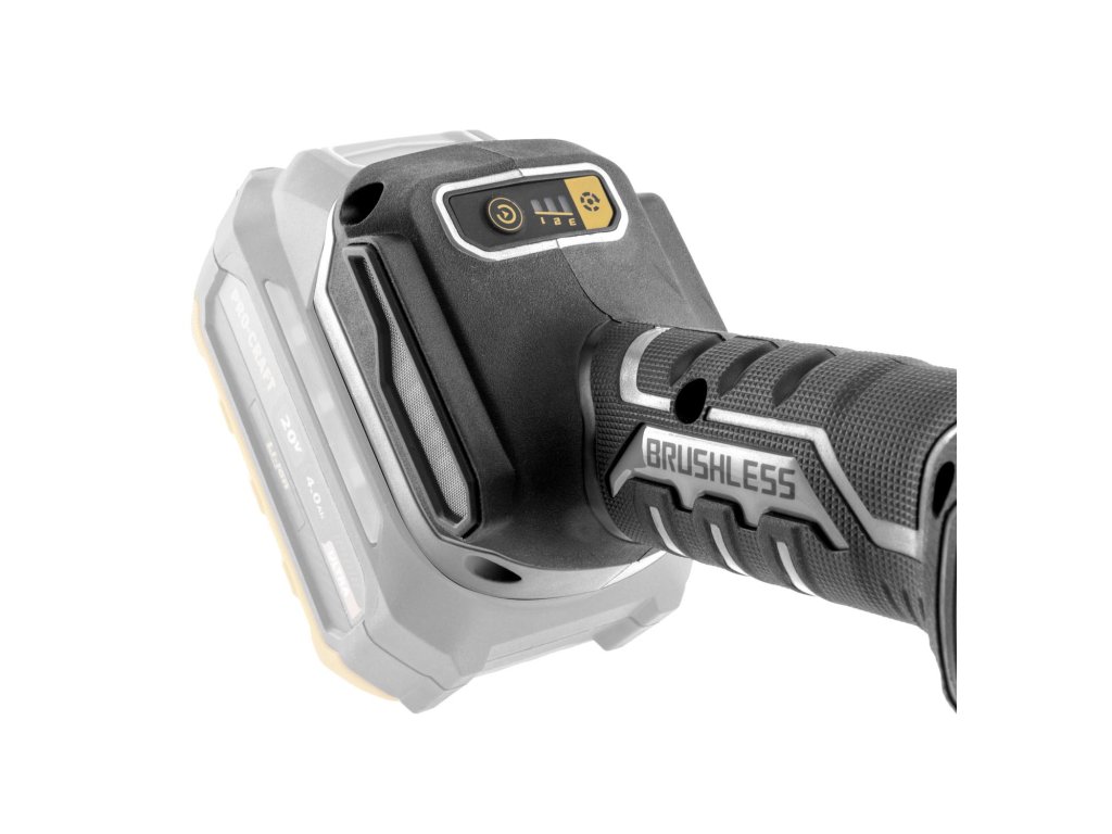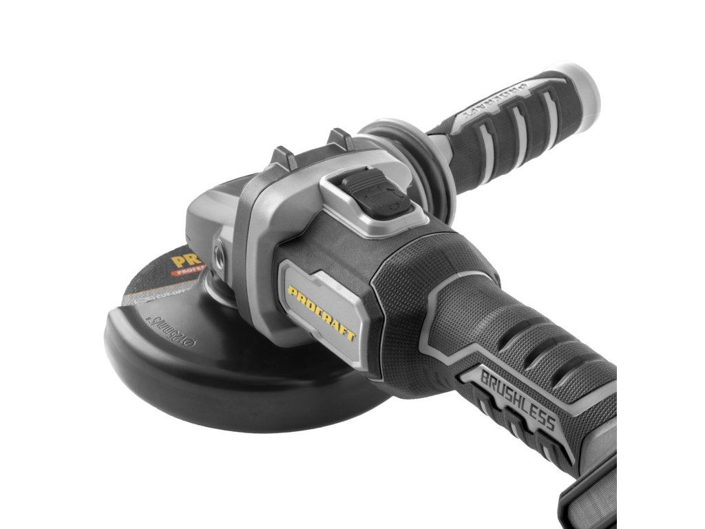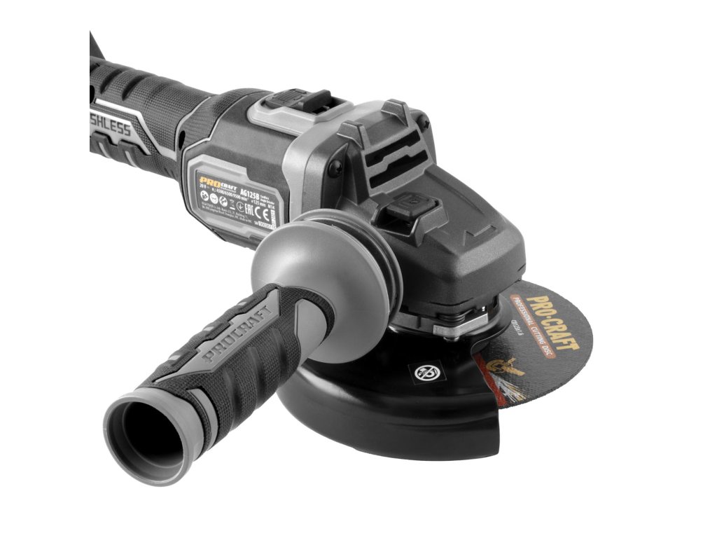 Aku úhlová bruska Procraft AG125B bb bez baterie a nabíječky) s bezuhlíkovým motorem, třemi rychlostmi (4500/6500/9500 ot./min) a průměrem kotouče 125 mm. Lehká (1,8 kg), s regulací otáček a protiskluzovým povrchem.