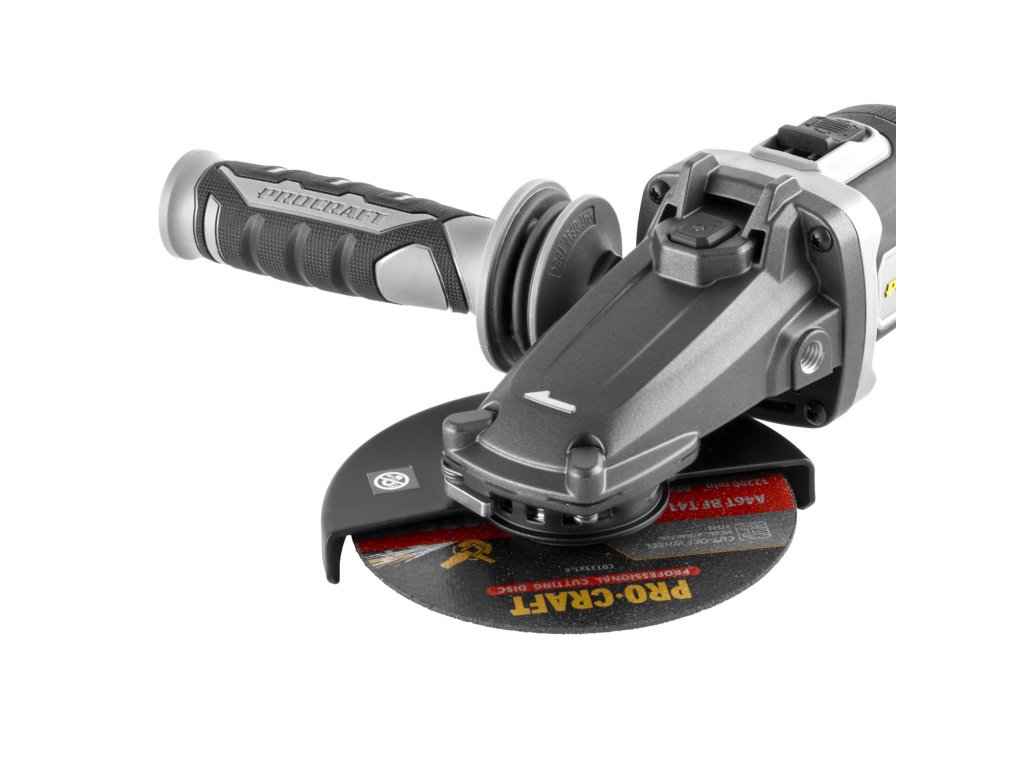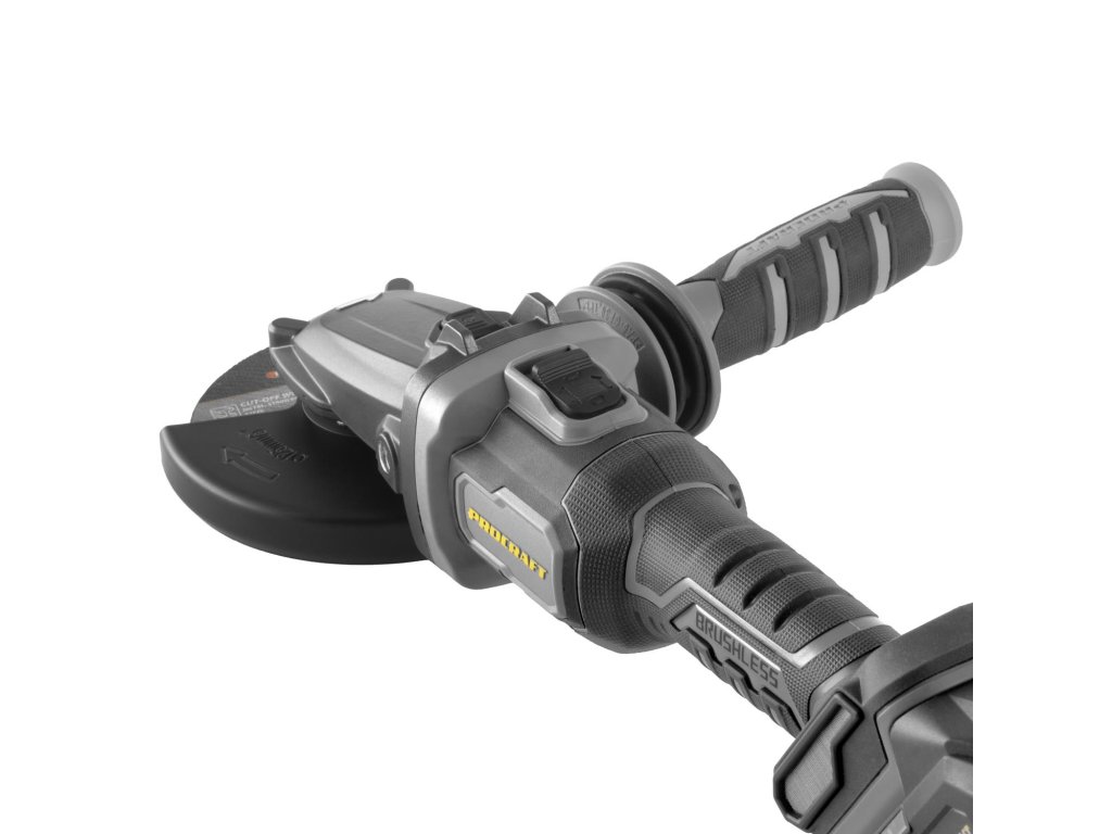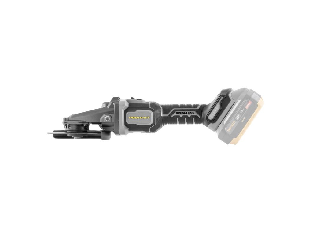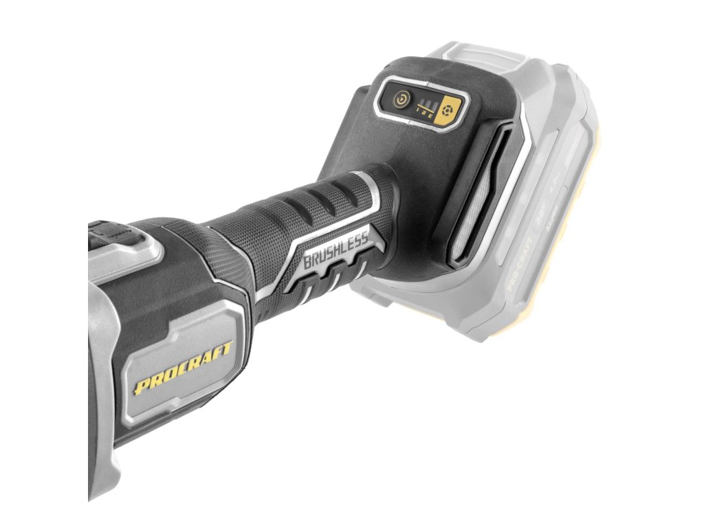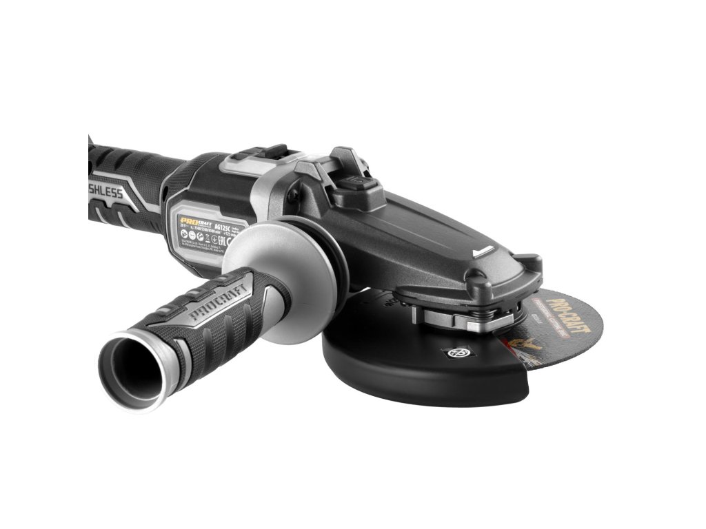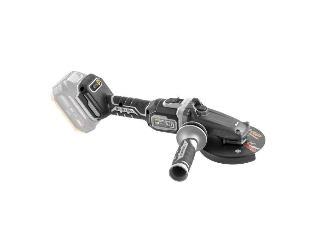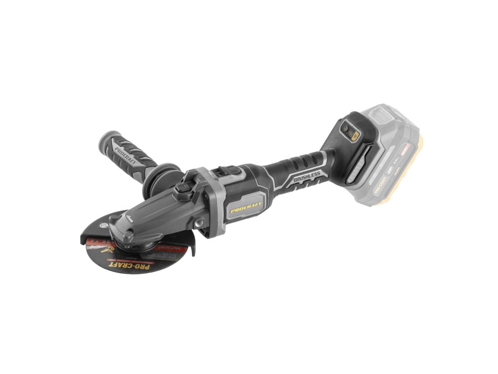 Aku úhlová bruska Procraft AG125C bb s plochou hlavou bez baterie a nabíječky) s bezuhlíkovým motorem, třemi rychlostmi (3500/5500/8500 ot./min) a průměrem kotouče 125 mm. Lehká (1,85 kg), s regulací otáček a protiskluzovým povrchem, funkce Kickback Control.