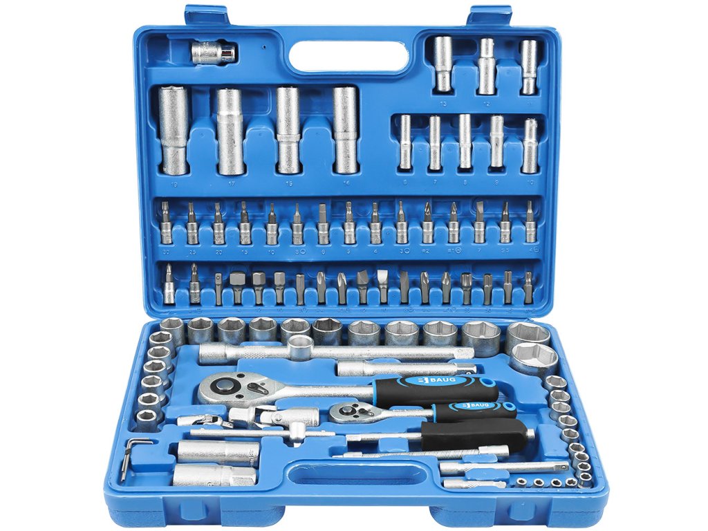 Gola sada 94 dílů, CrV BAUG je jedna z nejprodávanějších sad nástrčných klíčů z naší nabídky. Předurčuje to především poměr dobré kvality a dobré ceny. Sada obsahuje všechny běžné klíče, nástavce a páky, které potřebuje běžný uživatel.• Obsah sady