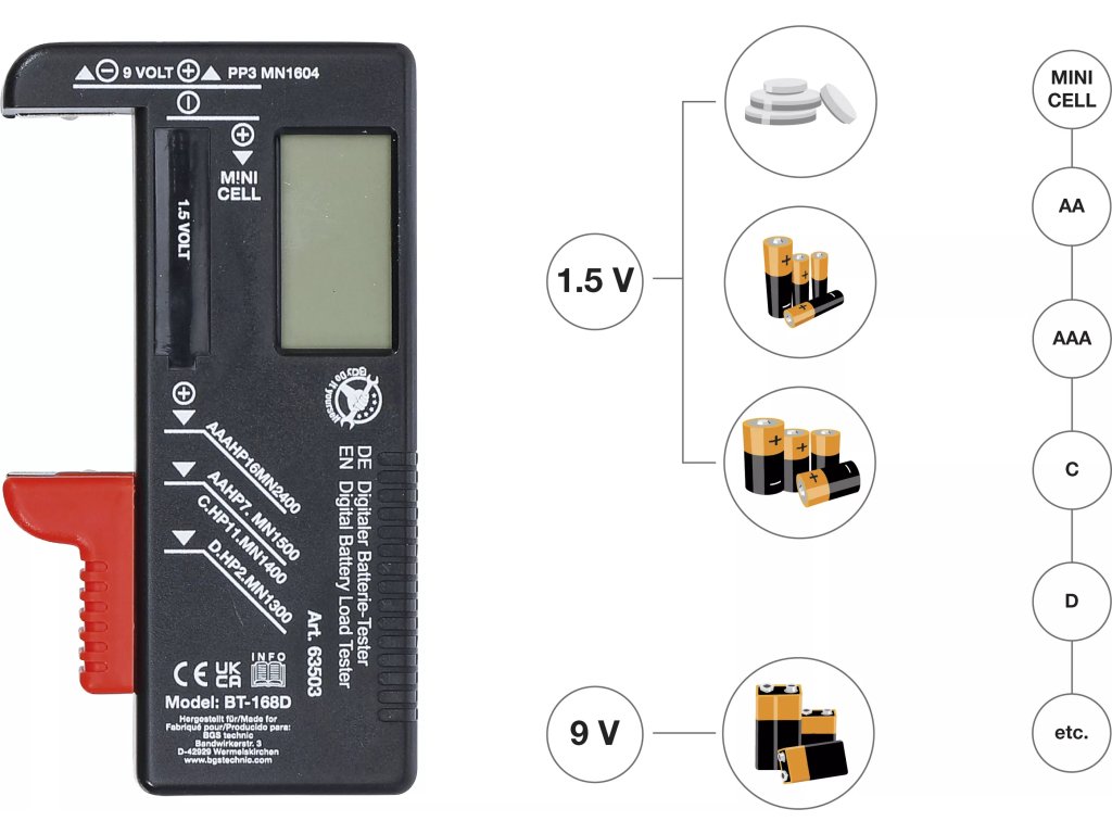 BGS Technic Digitální zkoušečka tester baterií 1,5V-9V (AAA, AA, A, R03, CR, LR6, apod.)