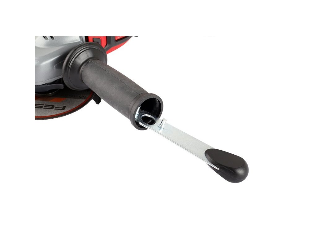 - bezpečnostní pojistka spínače proti náhodnému spuštění, tvar brusky v úchopové části ergonomicky tvarovaný a pogumovaný pro pohodlné držení a manipulaci při práci, tři možnosti polohy přídavné rukojeti, umístění ovládacích prvků uzpůsobené pro pravou i levou ruku, rychloupínací kryt