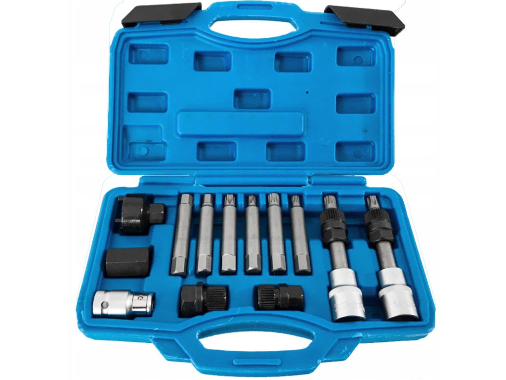Speciální sada klíčů pro montáž a demontáž alternátorů typu Bosch a Magneti Marelli.Vhodné pro automobily následujících značek: Audi, BMW, Fiat, Ford, Mercedes, Opel, Renault, Peugeot, Seat, Škoda, Volvo, VW a další. Klíče vám umožňují současně odšroubovat upevňovací šroub řemenice (pomocí příslušného bitu) a držet řemenici se spojkou (pomocí speciální objímky).