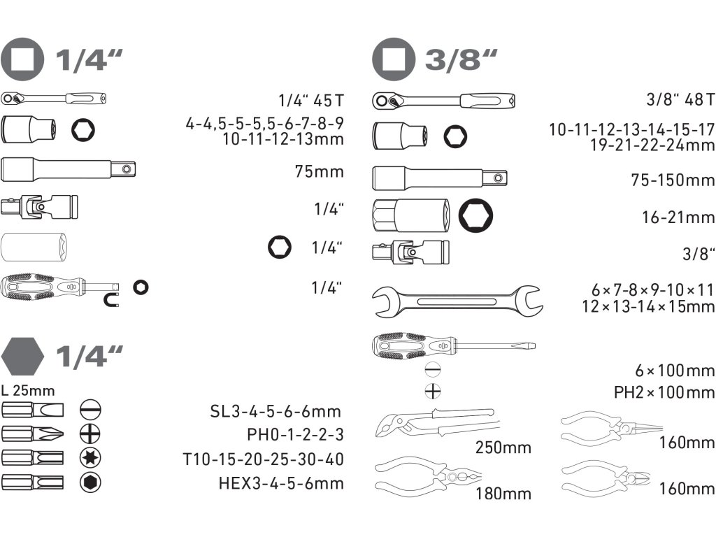 • hlavice nástrčné: 1/4": 4-4,5-5-5,5-6-7-8-9-10-11-12-13mm, 3/8": 10,11,12,13,14,15,17,19,21,22,24mm (CrV)