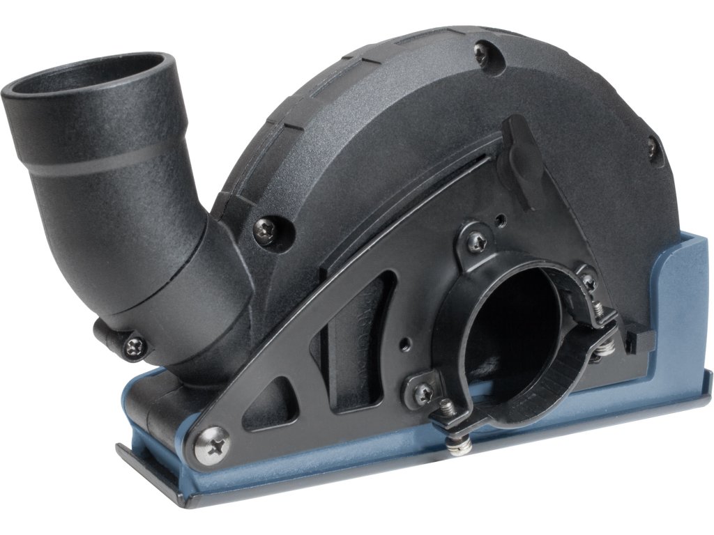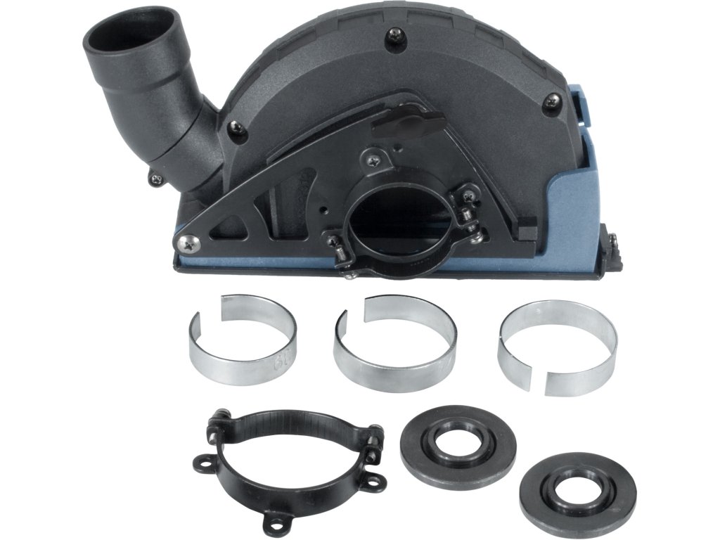 • za pomocí dvou nastavitelných fixačních objímek(límců) s odlišnými průměry v kombinaci s vymezovacími vložkami a vystřeďovacími podložkami lze tento odsávací kryt nainstalovat na všechny běžné typy 125mm úhlových brusek