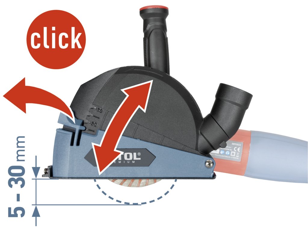 • přednastavené aretační pozice určují prořez materiálu: u kotouče o průměru 125mm je prořez 5-30mm a u kotouče s průměrem 115mm je prořez 5-25mm