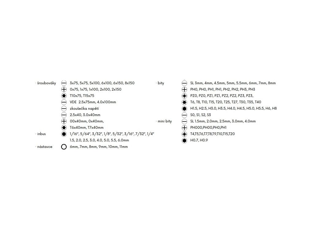 univerzálnost osazení této sady, nabizí široké spektrum jejího využitídříky šroubováků, bity i adaptéty na 6ti hrané vruty z kvalitní legované oceli S2, ergonomické rukojeti, certifikované elektrošroubováky