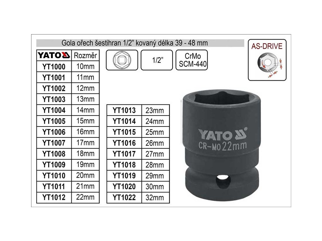 Gola ořech profil šestihran AS-DRIVE 1/2". Je vyroben z chrommolybdenové slitiny oceli CrMo SCM-440 Funkce AS-DRIVE umožňuje vyvinout větší kontaktní sílu, neboť ke kontaktu se šroubem nedochází na hranách šestihranu, nýbrž cca v první třetině styčných ploch. Tím nedochází k poničení hlavice. AS-DRIVE mnohdy povolí matice a šrouby již poničené.