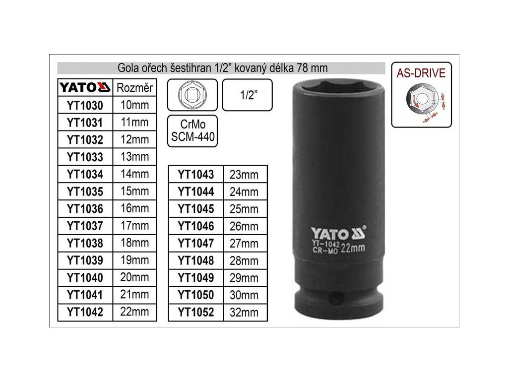 Gola ořech profil šestihran AS-DRIVE 1/2" prodloužený délka 78 mm. Je vyroben z chrommolybdenové slitiny oceli CrMo SCM-440 Funkce AS-DRIVE umožňuje vyvinout větší kontaktní sílu, neboť ke kontaktu se šroubem nedochází na hranách šestihranu, nýbrž cca v první třetině styčných ploch. Tím nedochází k poničení hlavice. AS-DRIVE mnohdy povolí matice a šrouby již poničené.