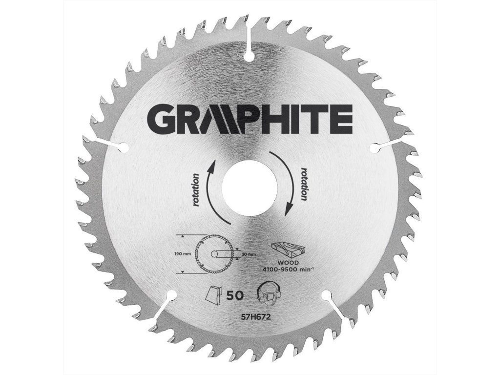 Pilový kotouč, widia, 190 x 30 mm, 50 zubů, tloušťka kotouče 2,2 mm, tloušťka zubu 3,2 mm, redukce: 30 x 16 mm, 30 x 20 mm, 30 x 25,4 mmVidiový pilový kotouč GRAPHITE vyrobený ze slitiny manganové oceli MN65 s velkou odolností vůči teplotám a deformacím. Zuby osazené plátky ze slinutého karbidu YG6A umožňují hrubé řezání dřeva a materiálů napodobujících dřevo, jako je překližka, dřevotřísková deska, MDF. Redukční kroužky obsažené v balení umožňují použití kotouče ve většině modelů pil.