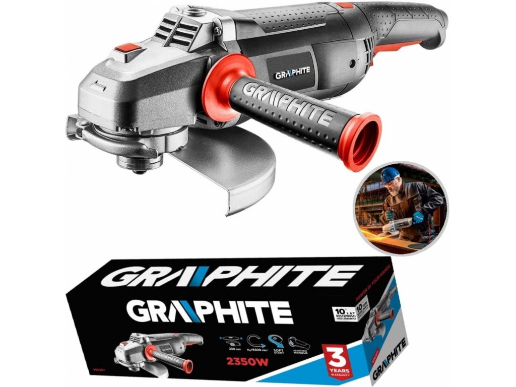 Vysoce kvalitní úhlová bruska GRAPHITE s motorem o vysokém výkonu 2350 W určena k řezání, broušení a leštění materiálů s různou strukturou a tvrdostí.Pro kotouč o průměru 230 mm. Zařízení díky svému ergonomickému tvaru a přesnému vyvážení poskytuje vysoký komfort při práci.