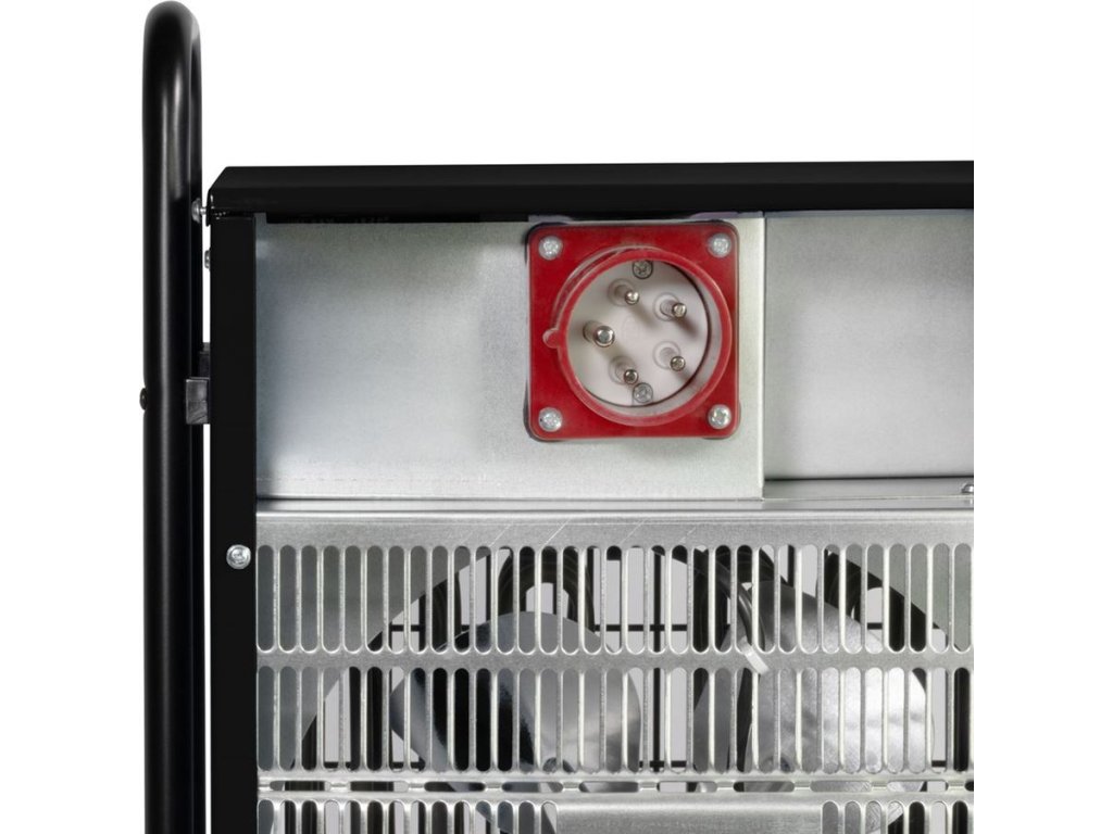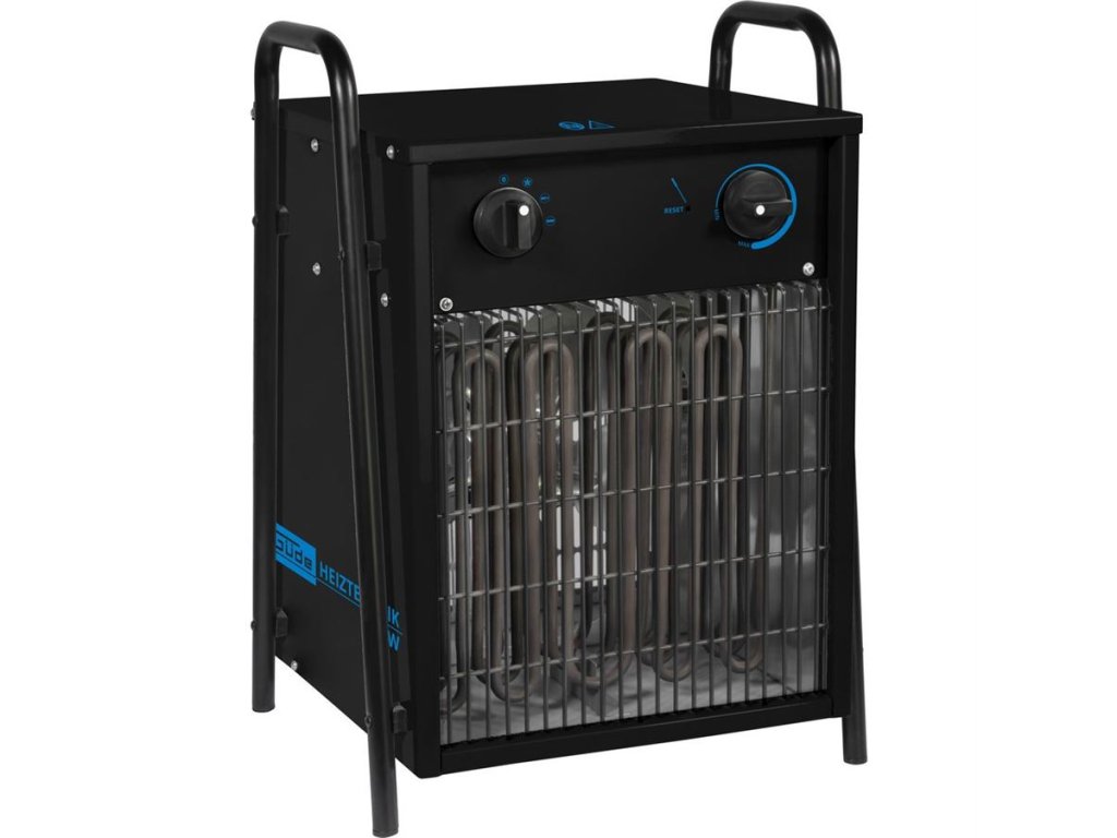 Max. topný výkon: 9 kW (-> 7.740 kcal/hod., 2 topné stupně: 4,5 kW/9 kW), prostorový termostat (-> automatické zapínání/vypínání topné spirály po dosažení nastavené teploty), ventilátor.