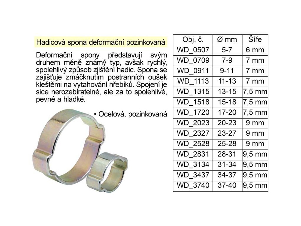 Deformační hadicové spony svým druhem představují méně známé, avšak velmi rychlé, spolehlivé a levné zjištění připojení hadic. Spona se zajišťuje pouhým zmáčknutím postranních oušek obyčejnými kleštěmi na vytahování hřebíků. Spojení je sice nerozebíratelné, ale za to spolehlivé a pevné.• Hadicová spona deformační pozinkovaná 37-40 mm