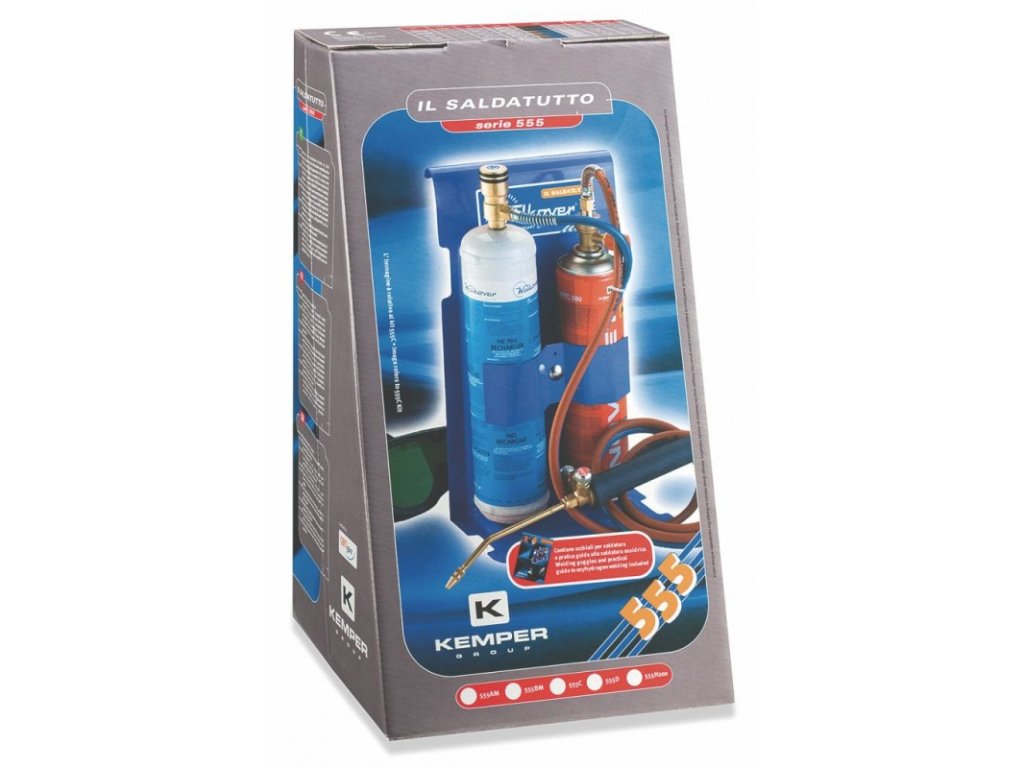Profesionální svářečská mini sada KEMPER 555D v praktickém stojanu je vhodná pro malé svařovací a pájecí práce ve zlatnictví, autoopravách, opravách chladících zařízení a pod. V balení jsou svářečské brýle a náhradní tryska 0,65 mm. Hořák je vybaven tryskou 0,5mm. Můžete používat s kartušemi SUPERGAS 600 (2.850 °C) nebo KEMAP (3300 °C). Předností této soupravy je snadná mobilita a manipulace. Pro svařování drátů do 2 mm a plechů do 1,0 mm. Teplota plamene dosahuje 2.850 °C. Délka hadic 2m. Hmotnost cca 5,5 kg Rozměry 230 x 195 x 350 mm. Doba svařování na jednu náplň představuje cca 1 – 2 hodiny, přesná doba však závisí na nastavení plamene.Obsah soupravy: