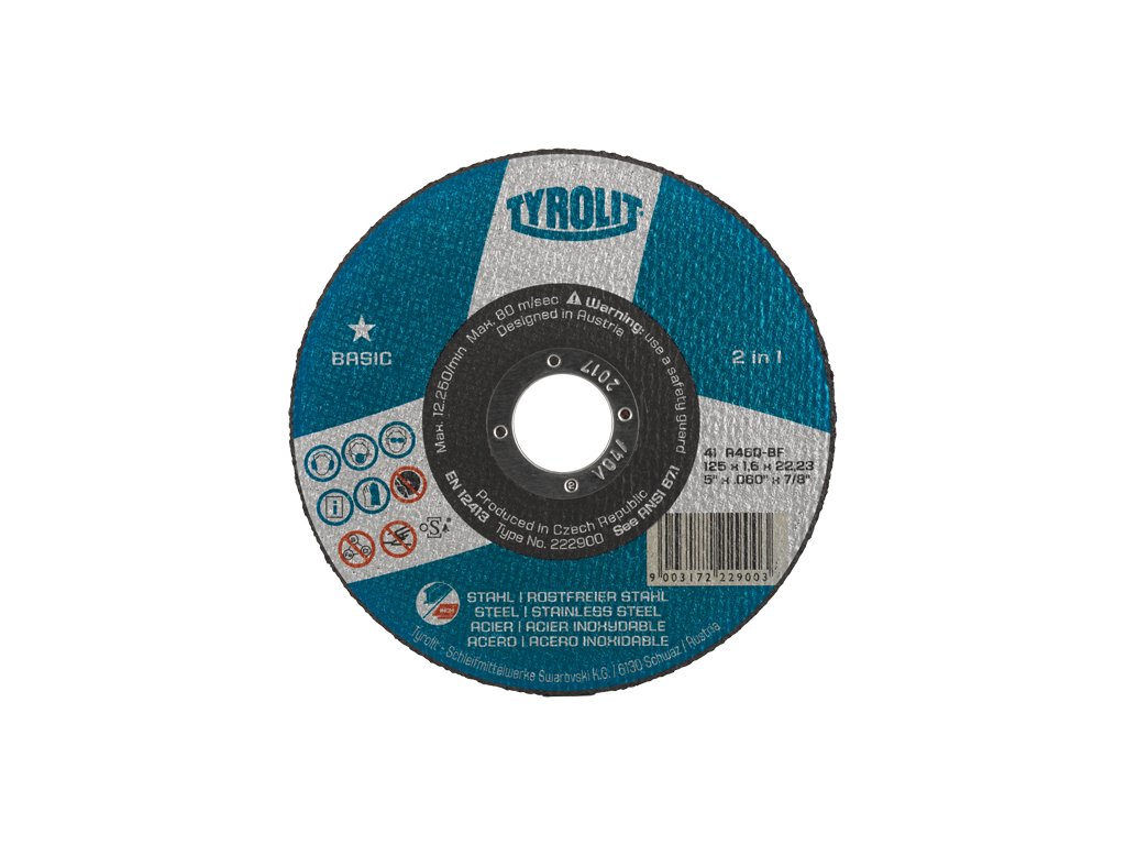 Řezný kotouč 125x1,6x22,2 A60 INOX TYROLIT BASIC NEW +35% výkonějšíkotouč do úhlové brusky rovného tvaru vhodný k řezání tenkostěnných plechů, profilů, trubek a tyčí /malé průřezy/ vyrobených z ocelí odolných proti korozi a kyselinám pro konstrukci strojů, zásobníků, vozidel a lodí.