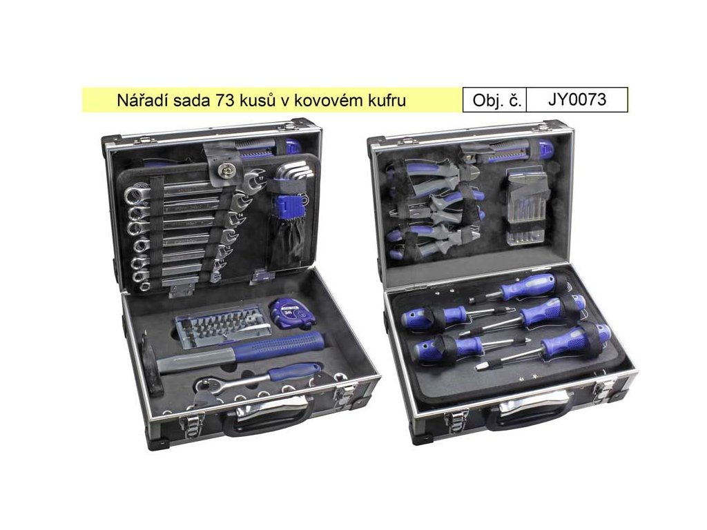 Kvalitní sada nářadí, vhodná například do automobilu, nebo dobytu, či pro údržbáře. Sada obsahuje velice zajímavý výběr potřebného základního nářadí, jako jsou kleště, klíče, šroubováky, kladivo, metr či nůž. Kvalita jednotlivých nástrojů není nijak ošizena a jsou uloženy bezpečně s vyloučením vypadnutí ze své polohy. Přehlednost jednotlivých druhů je dána rozložením do čtyř sortérů uvnitř kufru. Kufr je též stabilní s kvalitními panty a uzávěry.• Sada nářadí 73 dílů v kufru JY0073