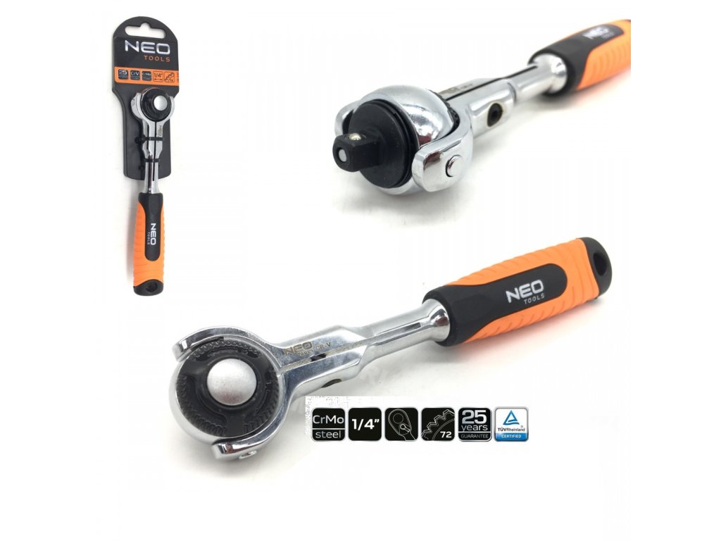 Ráčna, 1/4", 360°, 72T 08-540, NEO, nezbytné vybavení dílny či garáže každého mechanika nebo kutila. Ráčna je speciální nástroj určený pro utahování těžko dostupných šroubů a matic. Další zařízení je otočná hlava, která usnadňuje utahování součástek umístěných v neobvyklých úhlech a na těžko přístupných místech.Zásuvkový systém zabraňuje vypadnutí z ráčny během provozu.Ergonomická rukojeť ráčny je potažena dvěma materiály, což zajišťuje jistý a neklouzavý úchop. Tělo nástroje je vyrobeno z chrom-vanadiové oceli.