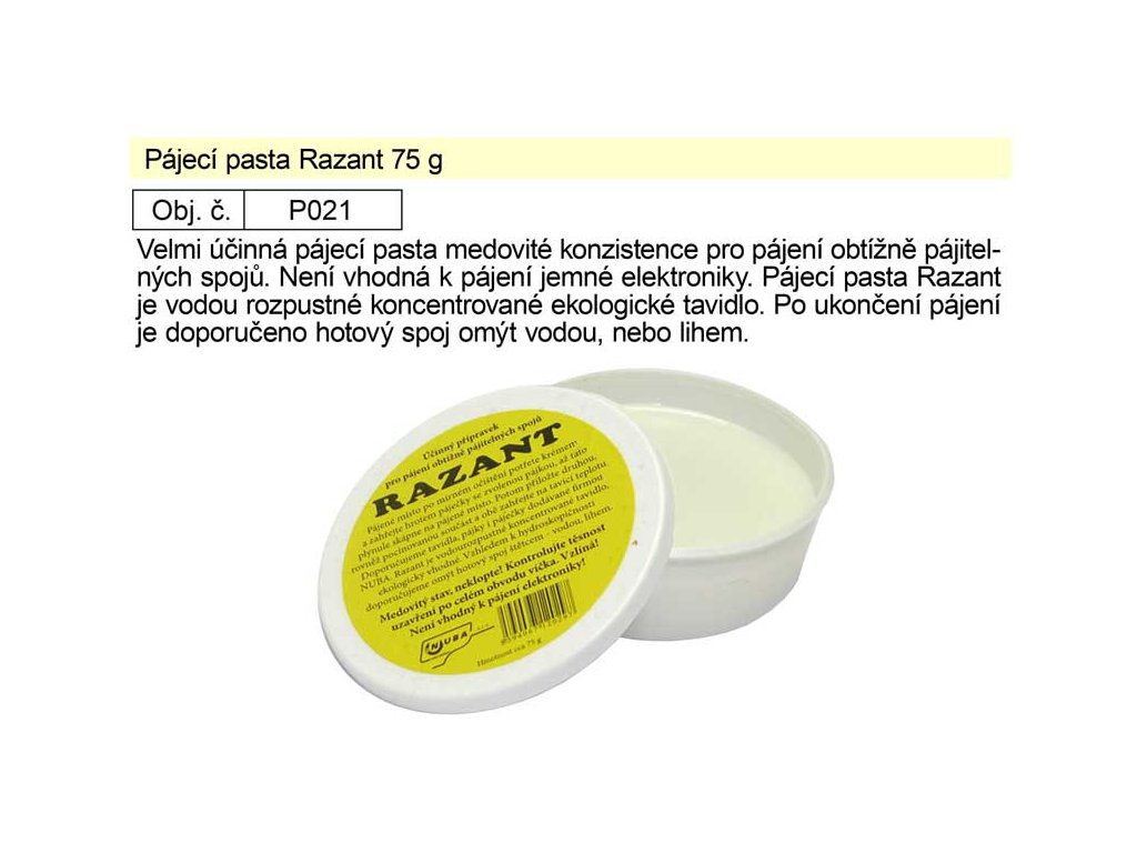 Velmi účinná pájecí pasta medovité konzistence pro pájení obtížně pájitelných spojů. Není vhodná k pájení jemné elektroniky. Pájecí pasta razant je vodou rozpustné koncentrované ekologické tavidlo. Po ukončení pájení je doporučeno hotový spoj omýt vodou, nebo lihem.• Pájecí pasta Razant 75 g