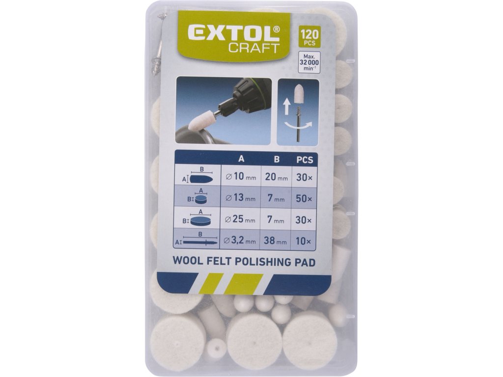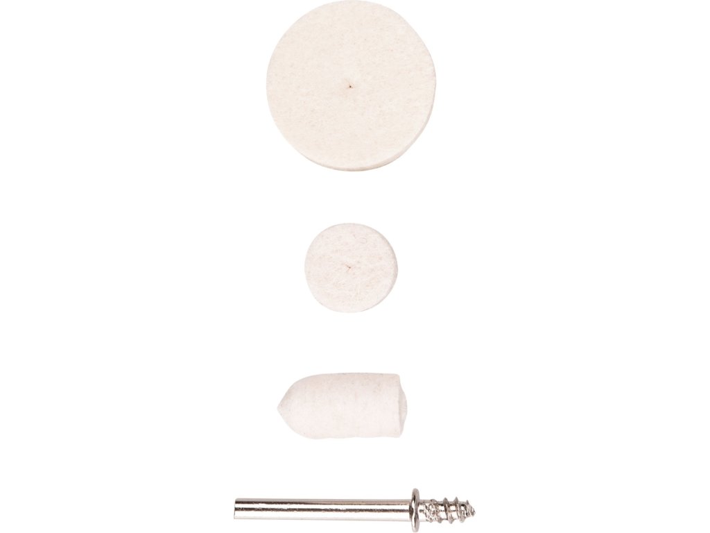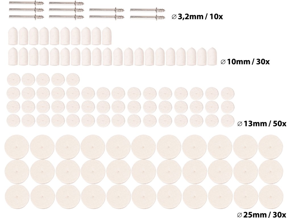 • doplňující parametr: plstěné kotouče: ?10 x 20mm - 30x, ?13 x 7mm - 50x, ?25 x 7mm - 30x, unašeč 10x, stopka ?3,2mm, plastová krabička