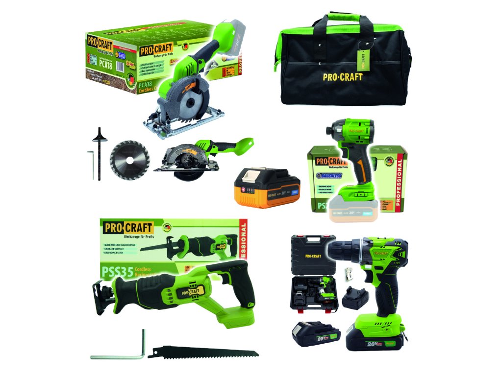 Procraft aku sada nářadí 20V, 6 dílů, 2× baterie s nabíječkou