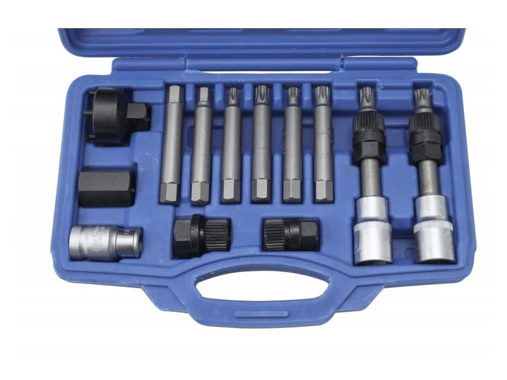 - celkem 13 různých bitů, klíčů, nástavců, hlavic a adaptérů pro servis alternátorů