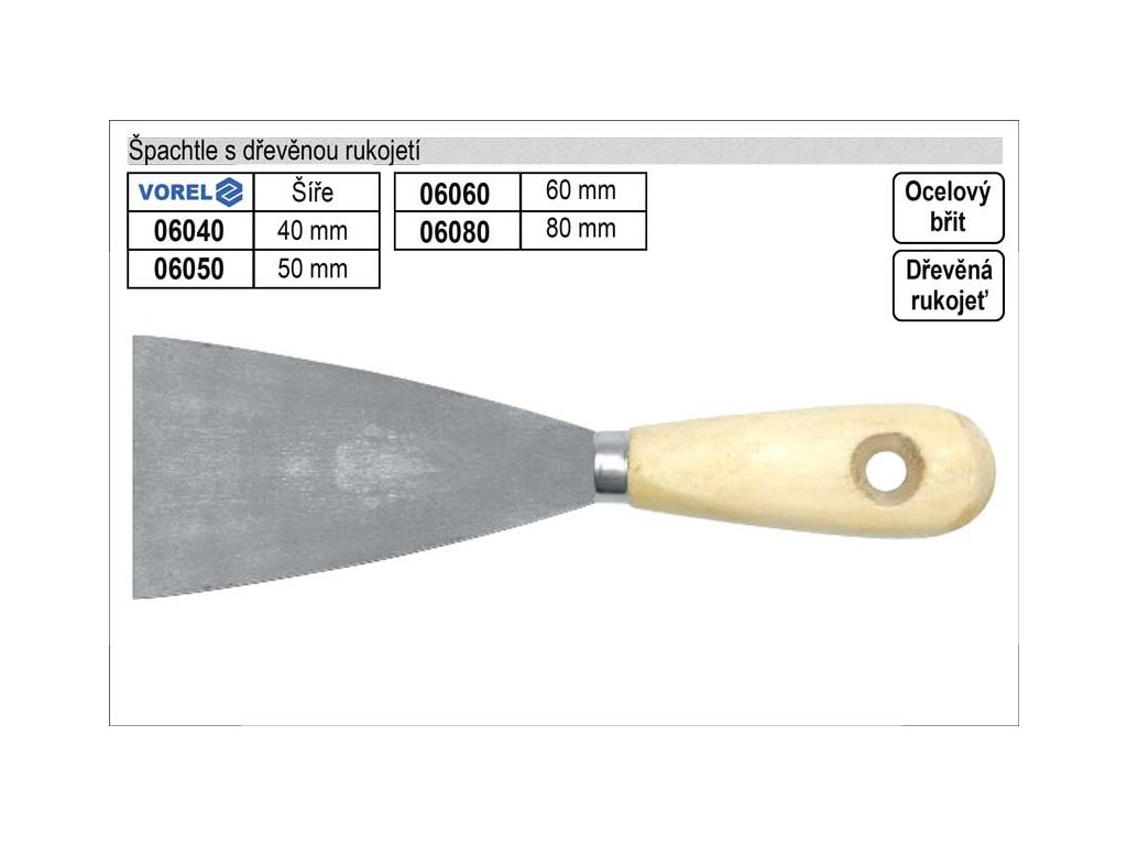 Špachtle je vyrobena z pružného plechu. S klasickou dřevěnou rukojetí pokrytou vrstvou bezbarvého laku.