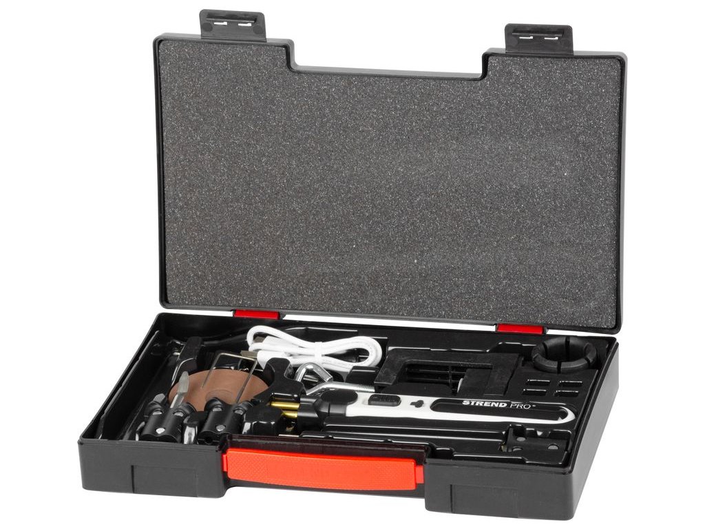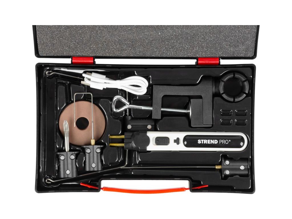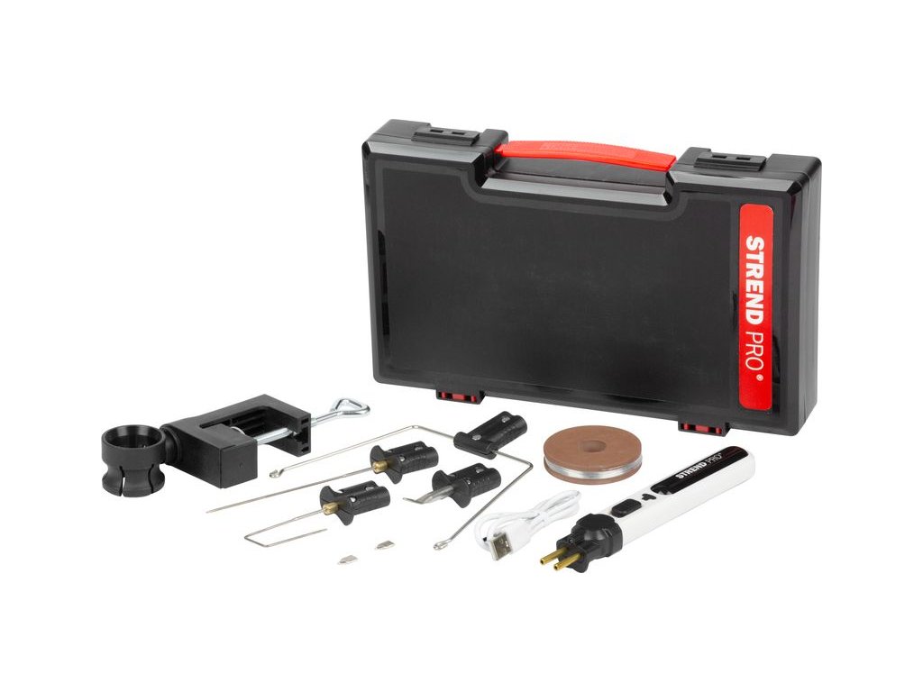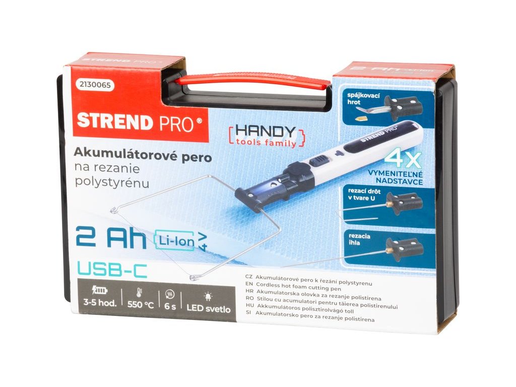 Akumulátorové pero Strend Pro je určeno pro jemné a přesné tvarové vyřezávání pomocí řezacího drátu, pro provádění zkracovacích řezů a vyřezávání větších předmětů nožem z polystyrenu. Sada obsahuje 4 různé řezací nástavce pro různé aplikace. Vidlice s řezacím drátem je určena pro jemné a přesné vyřezávání, krájení a tvarování materiálu. Řezací drát ve tvaru písmene U umožňuje drážkování do materiálu pro osazení kabelů. Pomocí řezací děrovací jehly lze vyřezávat různé tvary. S použitím speciálního hrotu pro pájení je akumulátorové pero pro řezání polystyrenu určeno i pro vytváření spojovaných spojů pomocí cínové pájky. Balení obsahuje akumulátorové pero, vidlici s řezacím drátem (10 m x 38 mm), řezací nůž ve tvaru U, řezací jehlu, svorku pro upevnění k pracovnímu stolu, nástavec s pájecím hrotem a USB-C nabíjecím kabelem.