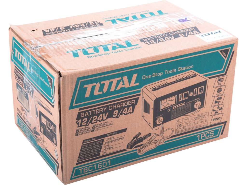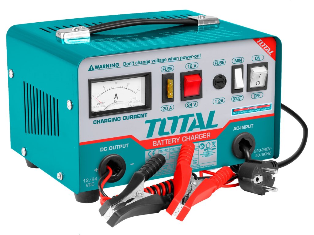 Starý osvědčený model autonabíječky vybavený ampérmetrem. Zvládá nabít baterie až do kapacity 180Ah. Snadno přístupná pojistka, snadné ovládání. Nabíječka autobaterií TOTAL používá funkci rychlého nabíjení. Je určená pro nabíjení olovo-kyselinových baterií s napětím 12V, 24V s kapacitou baterie od 28Ah do 180Ah. Váží 5,8kg.