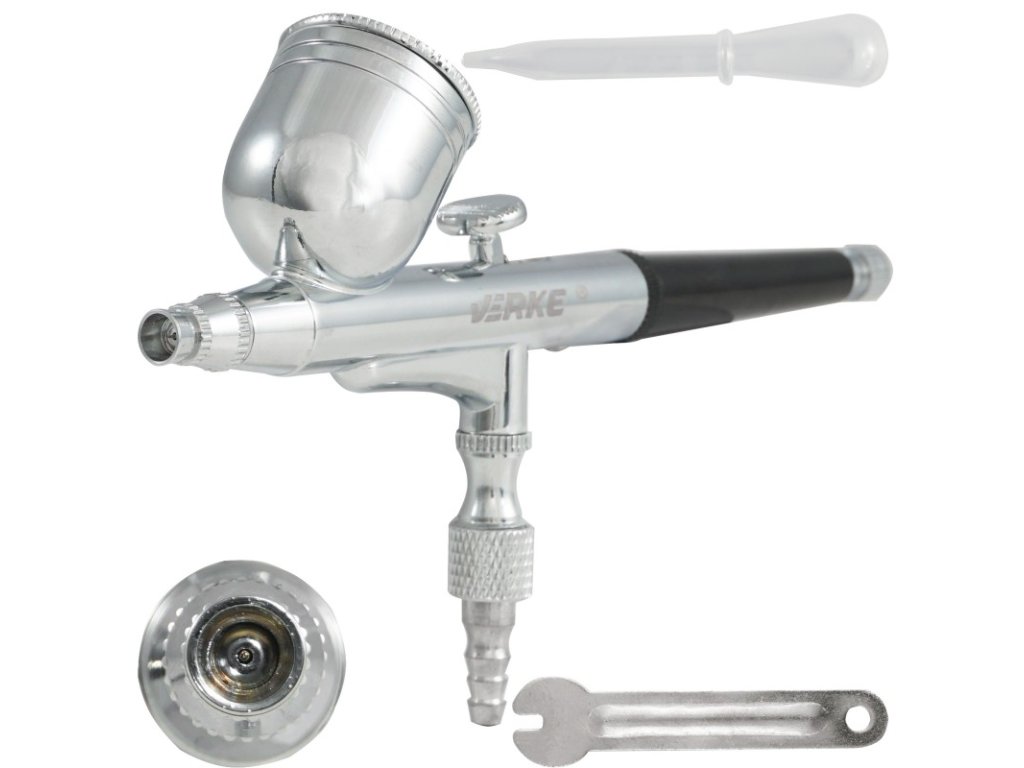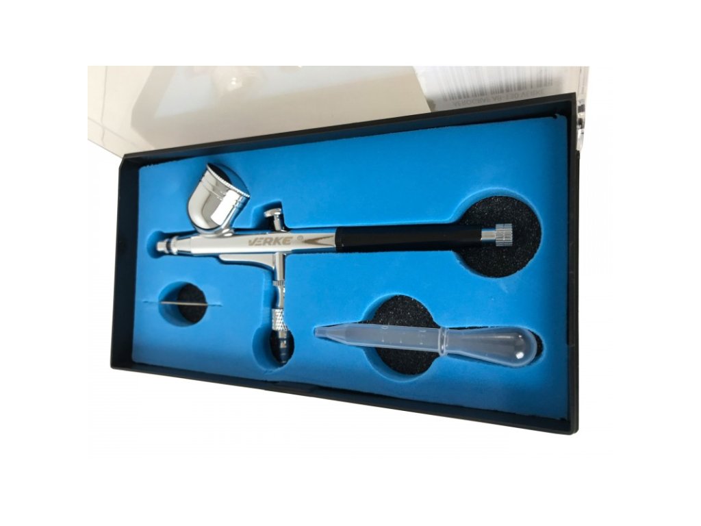 Airbrush – mini stříkací pistole se používá jak pro malování rovných ploch, tak i tvarově složitých předmětů. Umožňuje malovat přesné detaily. Používá se při retuši, konzervaci, modelování, ručním zdobení drobných předmětů i jako výtvarná technika (airbrushing).Velmi vysoká přesnost nanášení barvy, profesionální provedení, tryska z kvalitní nerezové oceli zajišťující dlouhou životnost pistole, nízká hmotnost a velikost, dvojité nastavení nástřiku, výborná kvalita, vyrobeno z korozivzdorné oceli.