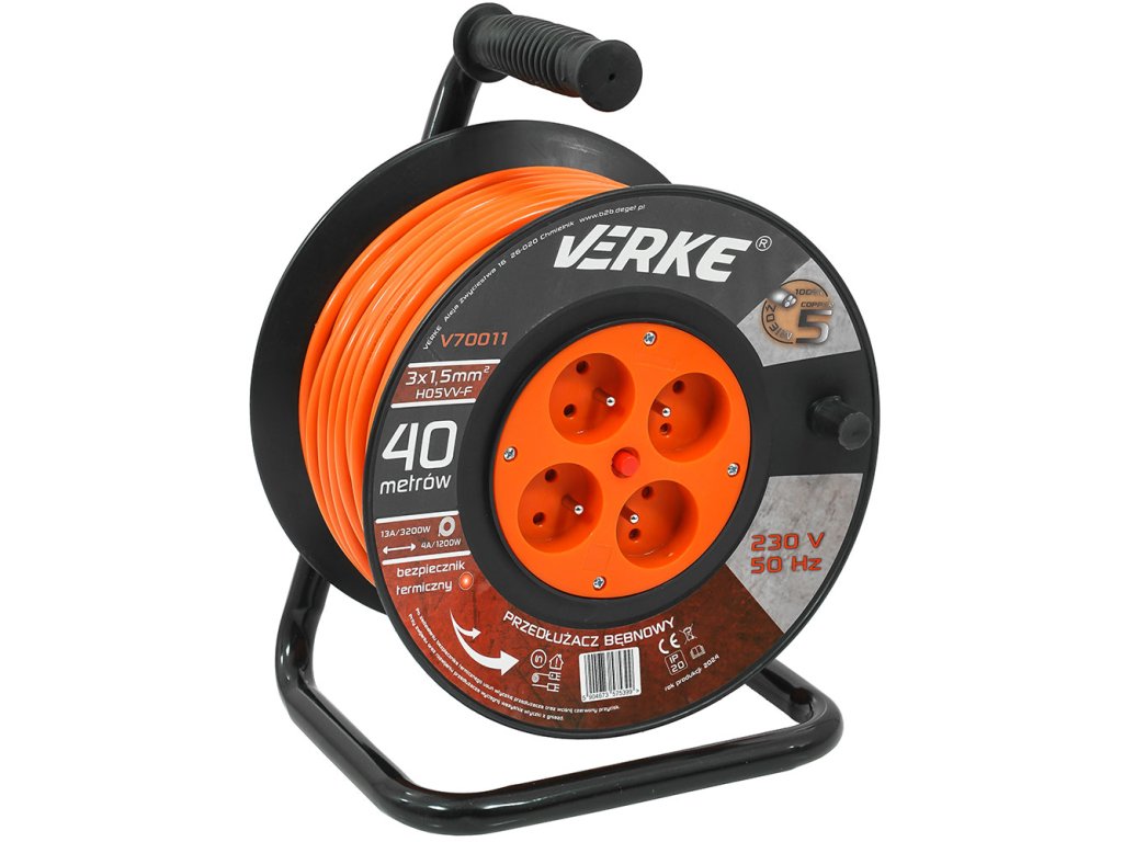 VERKE Bubnový prodlužovák V70011. Kvalitní naviják - prodlužovací kabel o délce 40 m se 4 zásuvkami. Kabel je vyroben ze 3 měděných vodičů o průřezu každého 1,5mm2. Tento průřez kabelu umožňuje k těmto prodlužovacím kabelům připojit čtyři zařízení současně, což se hodí zejména na stavbách nebo v dílnách. Kabely jsou pokryty PVC izolací, která je vysoce odolná proti mechanickému poškození, atmosférickým vlivům a chemickým látkám. Prodlužovačka je vybavena tepelnou pojistkou.Technické údaje: