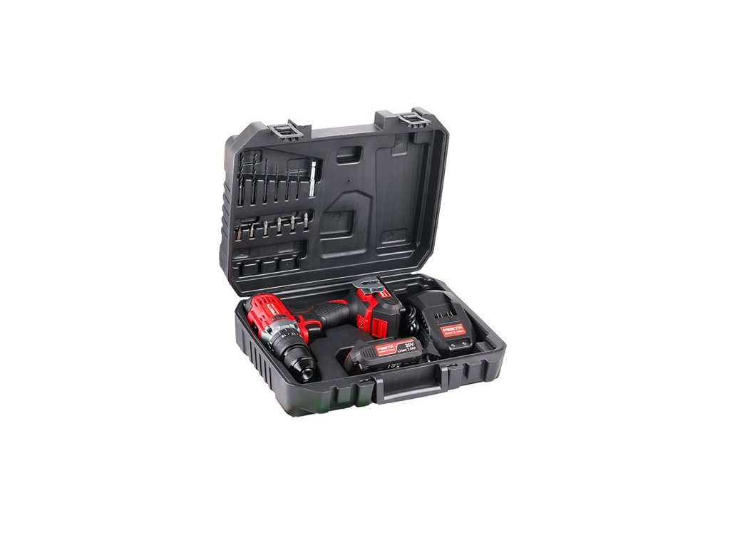 - v praktickém setu v kufru je kromě AKU vrtačky také - 2 x baterie 2.0 Ah, rychlonabíječka 2.4 A, unašeč 1/4", bity a vrtáky HSS