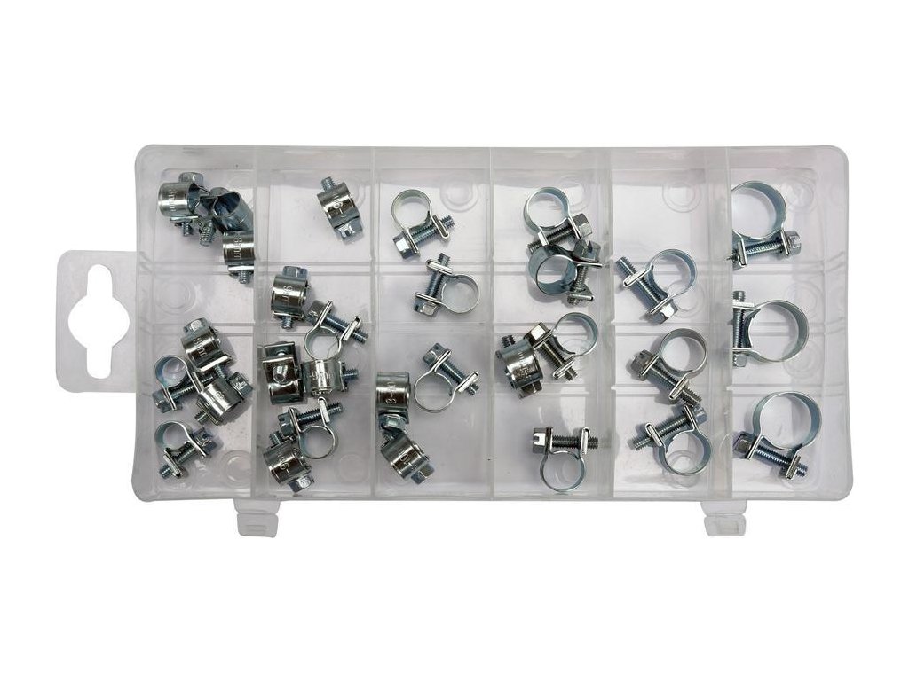 Sada 30 ks univerzálních spon, pro hadičky, kabeláž apod.Vše je přehledně uspořádáno v kompaktním plastovém kufříku.