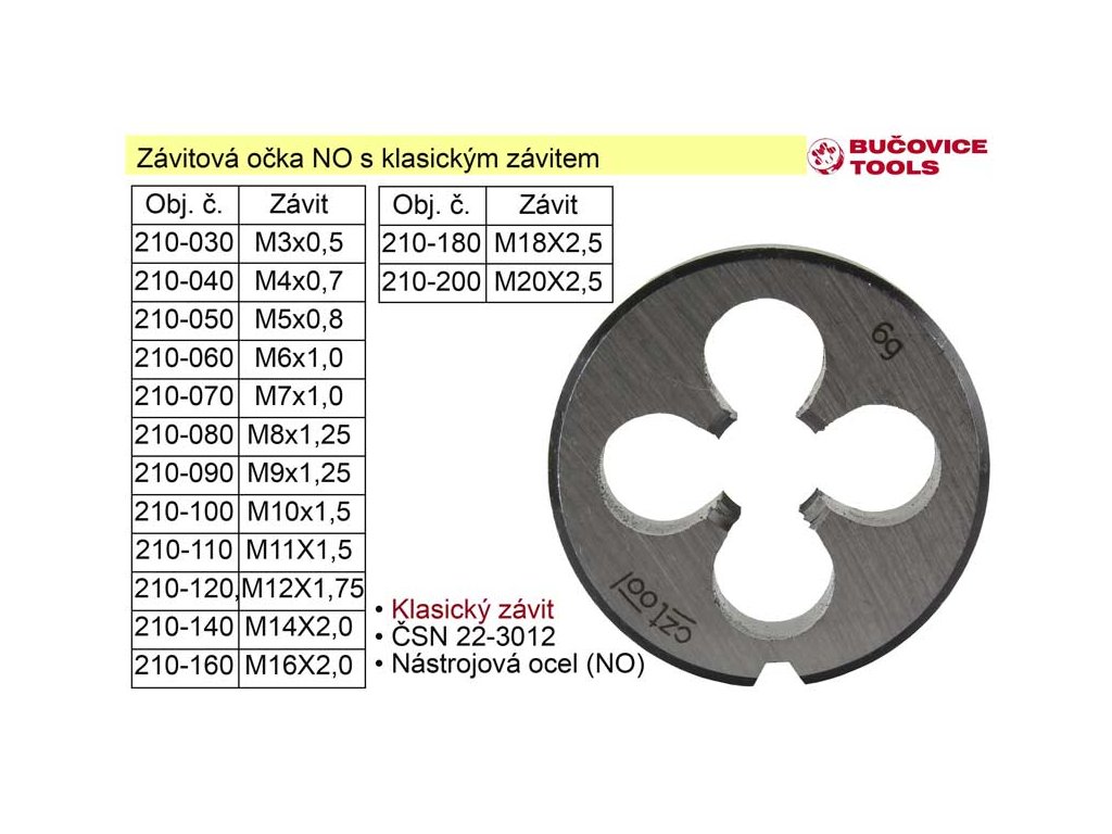 Závitové očko - kruhová čelist s klasickým závitem, vyrobené z nástrojové oceli (NO) od Českého výrobce Bučovice Tools .• Závitové očko M7x0,75 NO jemný závit